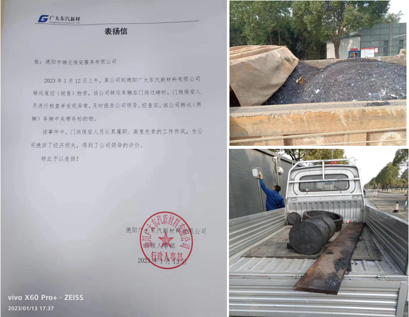 1月12日上午,我公司駐廣大東汽保安班當(dāng)班隊(duì)員查獲非法夾帶物資兩車,為客戶挽回了一定的經(jīng)濟(jì)損失,我公司保安員認(rèn)真履職、高度負(fù)責(zé)的工作態(tài)度得到了甲方領(lǐng)導(dǎo)的高度評(píng)價(jià)。